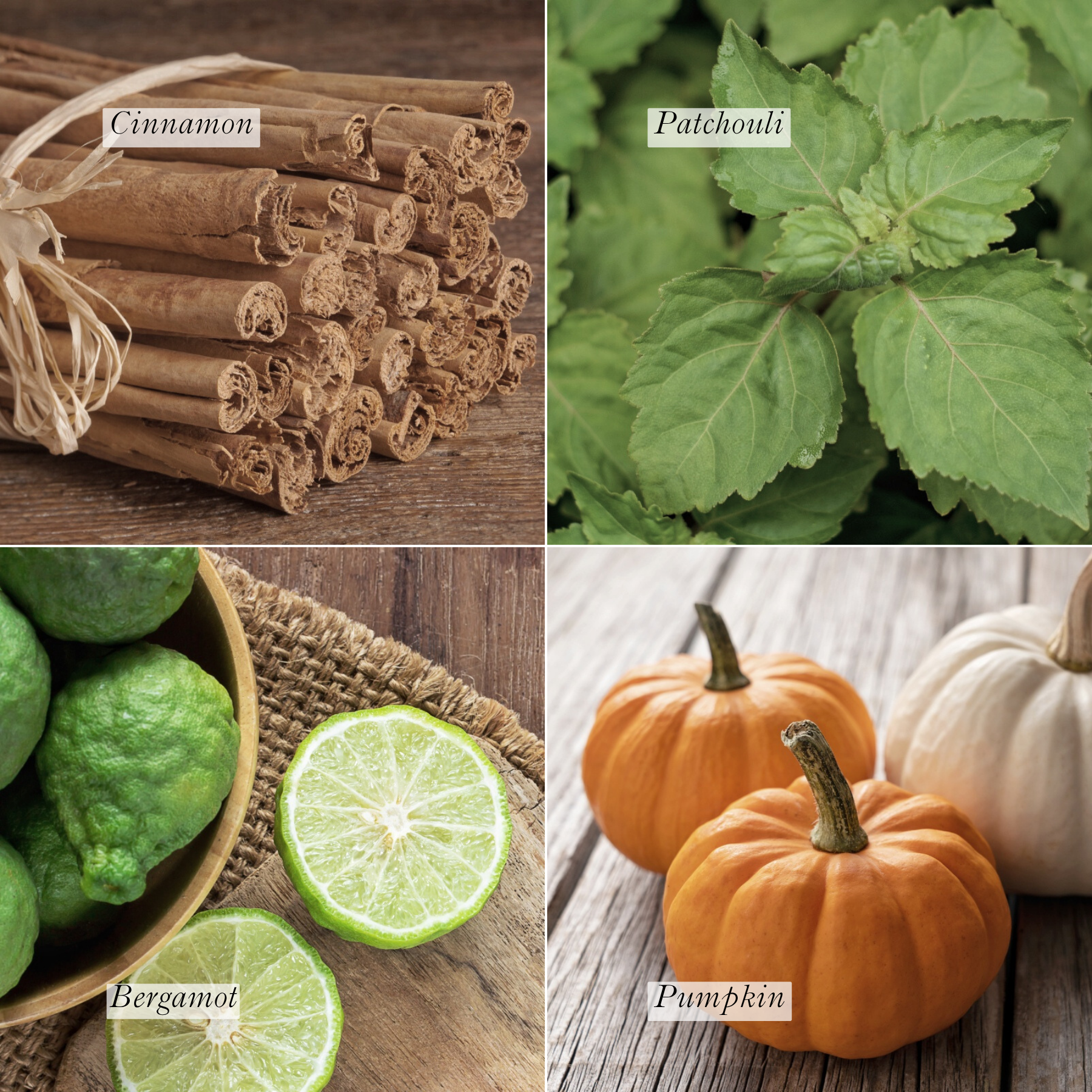 Essentials oils: Cinnamon Leaf Oil, Patchouli Oil, Bergamot Oil, Cedarwood Oil